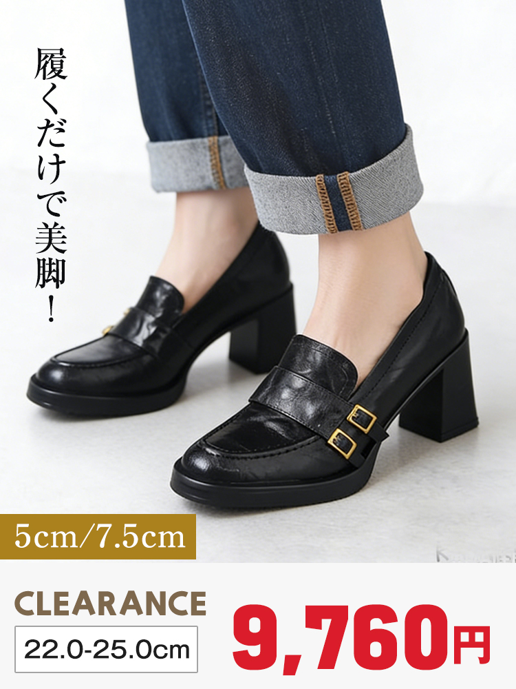 【安定感抜群・走れる太ヒール】KENPOGEN ダブルバックル ローファー 5cm 7.5cm 選べる高さ 痛くない 通勤 黒 スクエアトゥ860 円引き