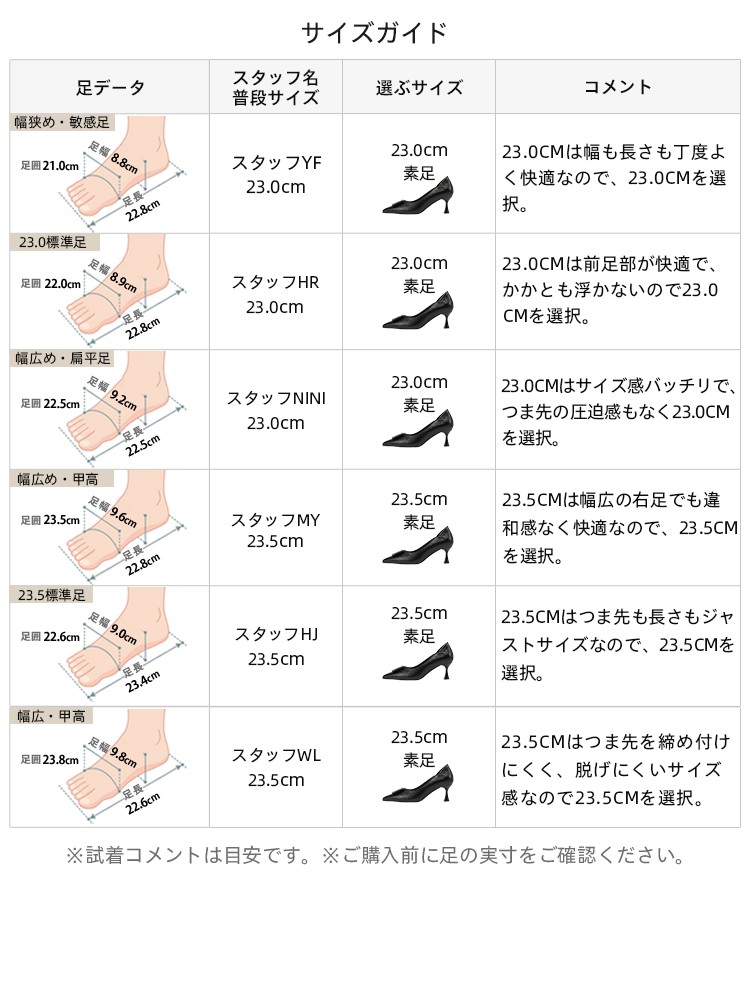 【ブラック・5.5cmヒール】夏のオフィスカジュアルや日常使いに最適なローヒールパンプス。歩きやすさと美しい横顔を両立したポインテッドトゥ。 夏の通勤カジュアルに似合う黒のバックルパンプス。選べる5.5cm・7.5cmヒールで美脚と歩きやすさを両立。 夏のオフィスカジュアルを格上げする肌馴染みの良いベージュパンプス。ポインテッドトゥでシャープな足元に。 夏の商談やプレゼンに最適。スーツスタイルに信頼感を添える、歩きやすくて痛くない黒のフォーマルパンプス。 涼しげな夏のスカートコーデに合わせたいベージュパンプス。素肌を美しく魅せるヌーディーな足元で休日のお出かけにも。 夏の靴選びの悩みを解決。通勤もデートも妥協したくない大人の女性へ贈る、シーンに合わせて選べる2つのヒール高。 用途で選べる2つのヒール高。夏の通勤に疲れない実力派5.5cmと、スタイルアップを叶える絶対美脚の7.5cmヒール。 ヒールの高さで変わる夏のスタイリング。疲れ知らずの5.5cmはパンツスーツで仕事用に、7.5cmはロングスカートで華やかな印象に。 選ばれる4つの理由。かかとを踏んで夏のミュールとしても履ける便利な2WAY仕様と、本革のような上質感のあるデザイン。 一足で二通りの履き方。きっちり魅せる通勤用パンプスから、かかとを折って涼しげな夏のミュールサンダルへ自在にチェンジ 暑い夏も快適な歩行をサポート。厚手のかかとクッションが靴擦れを防止し、汗ばむ季節でも脱げにくくしっかり足にフィット 夏のオフィスカジュアルに馴染む黒のヒールパンプス。ほどよい高さで疲れにくく、パンツスーツでの通勤も快適で美しい脚のラインを演出します 夏のきれいめカジュアルやデニムコーデを格上げする黒パンプス。履くだけでスタイルアップを叶える魔法の美脚シルエット 大人の品格漂うスクエアバックルと、本革のような奥行きのあるツヤ感。夏の通勤コーデに高級感を添える上品なデザインの黒パンプス 夏の突然の雨や梅雨時期にも安心な撥水仕様。本革のような風合いながら、驚くほど軽くてお手入れも簡単な高機能素材の通勤パンプス 足裏への負担を軽減するふかふかのマシュマロクッションインソール。夏の暑い日の長時間の通勤や立ち仕事でも痛くならない快適な履き心地 雨に濡れた夏の路面でも滑りにくい、グリップ力抜群のラバーアウトソール。ヒールでも安定感があり、毎日の通勤歩行を安全にサポート 夏のオフィスカジュアルからお呼ばれワンピースまで万能に使える黒パンプス。洗練された都会のレディを演出する、媚びない強さと優雅さを足元に 夏の淡色コーデや涼しげなワンピースに相性抜群のベージュパンプス。足元に大人の抜け感と上品な甘さをプラスする、愛されオフィスルック 大人の品格を上げるスクエアバックルと、夏の汗ばむ足元も蒸れずに快適なふかふかクッション。デザインと機能を両立した優秀パンプス 夏の急な雨でも滑りにくい実力派ラバーソールと、無理せず美脚を叶える魔法のくびれヒール。オンオフ問わず活躍する疲れ知らずの一足 夏の通勤靴選びに迷ったらこれ。お客様から「驚くほど疲れにくい」「本革のような高見え素材でコスパ最高」と高評価の口コミを多数いただいております。 ネットでの靴選びも安心のサイズガイド。幅広や甲高など様々な足の形のスタッフが試着し、あなたにぴったりの夏の痛くないパンプス選びをサポート。 夏のハレの日やきちんとしたオフィスコーデに。ネイビーのプリーツスカートに5.5cmのアイボリーパンプスを合わせ、エレガントで涼しげな装いを格上げ。 夏のモノトーンコーデに抜け感を作る黒パンプス。5.5cmヒールなら極上のフィット感で、退勤時の帰り道まで足が痛くならず笑顔で歩けます。 夏の勝負の日のキャリアスタイル。スニーカーのような快適な履き心地の7.5cmアイボリーパンプスが、足の痛みを忘れさせ働く女性に自信をくれます。 涼しげな夏のブルーワンピースコーデ。甘くなりがちなスタイルも、7.5cmの黒パンプスを合わせることで、凛とした大人の女性らしい足元に引き締まります。 【アイボリー・5.5cmヒール】夏の足元を明るく軽やかに魅せる淡色ローヒール。肌馴染みが良く、どんなサマーコーデにも合わせやすい万能カラー。 【ブラック・7.5cmヒール】夏のフォーマルシーンやスタイルアップを狙いたい日に。スクエアバックルが高級感を放つ、美脚シルエットのハイヒール。 【アイボリー・7.5cmヒール】夏のデートや華やかな通勤スタイルに。ヌーディーな色合いと7.5cmの高さが、圧倒的な美脚と大人可愛い女性らしさを引き出します。