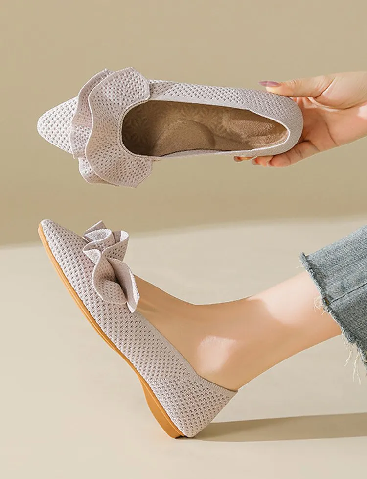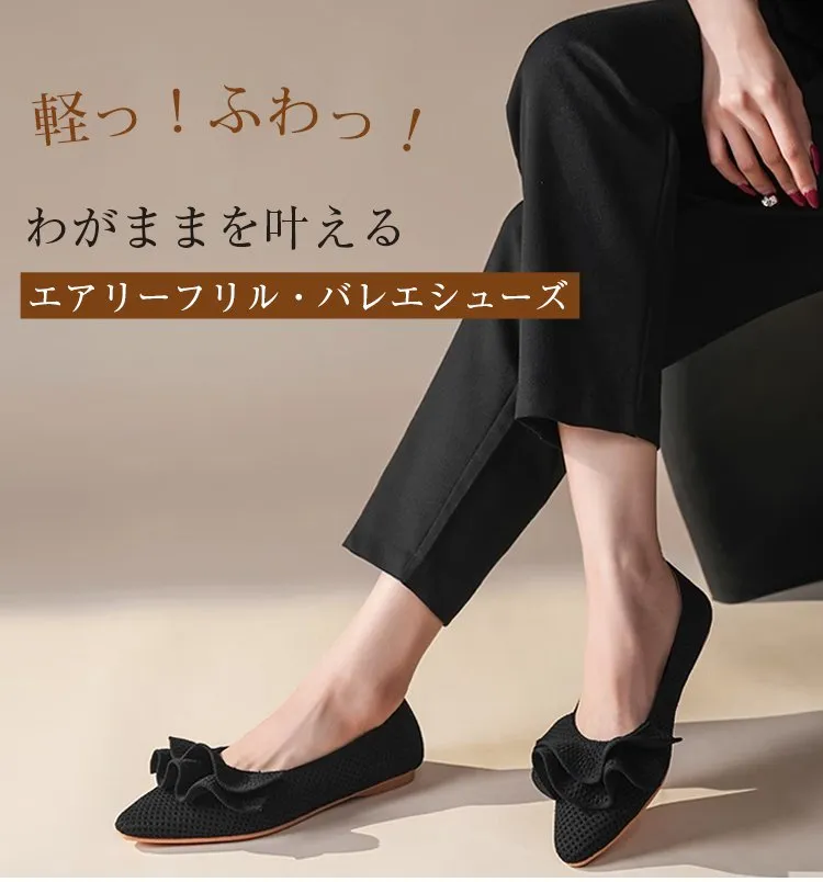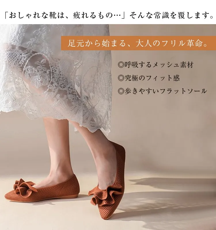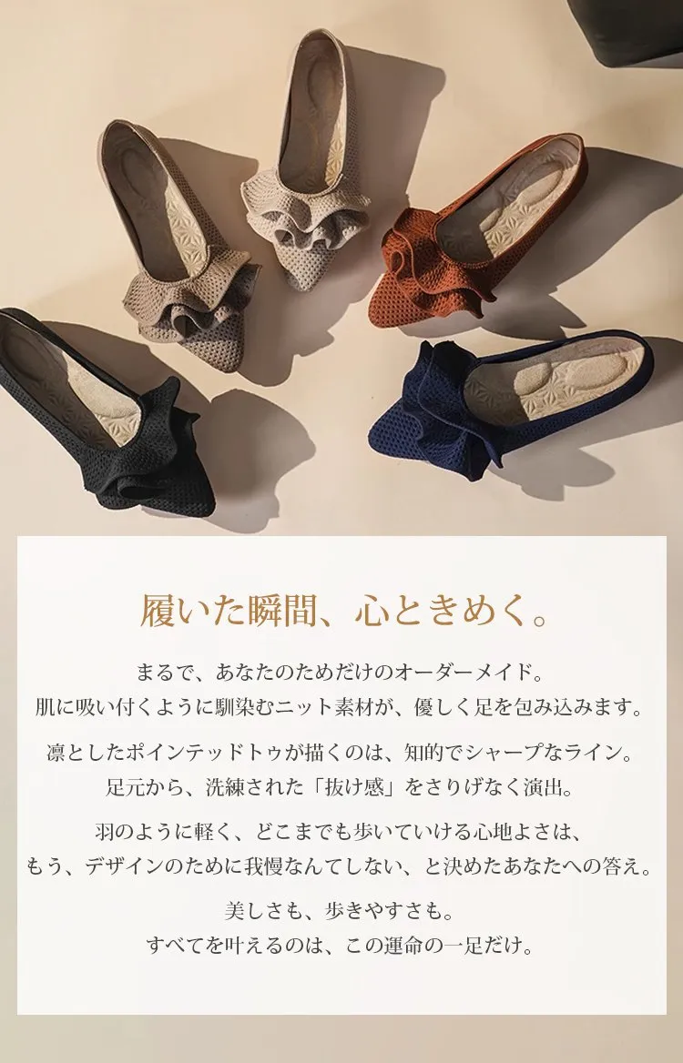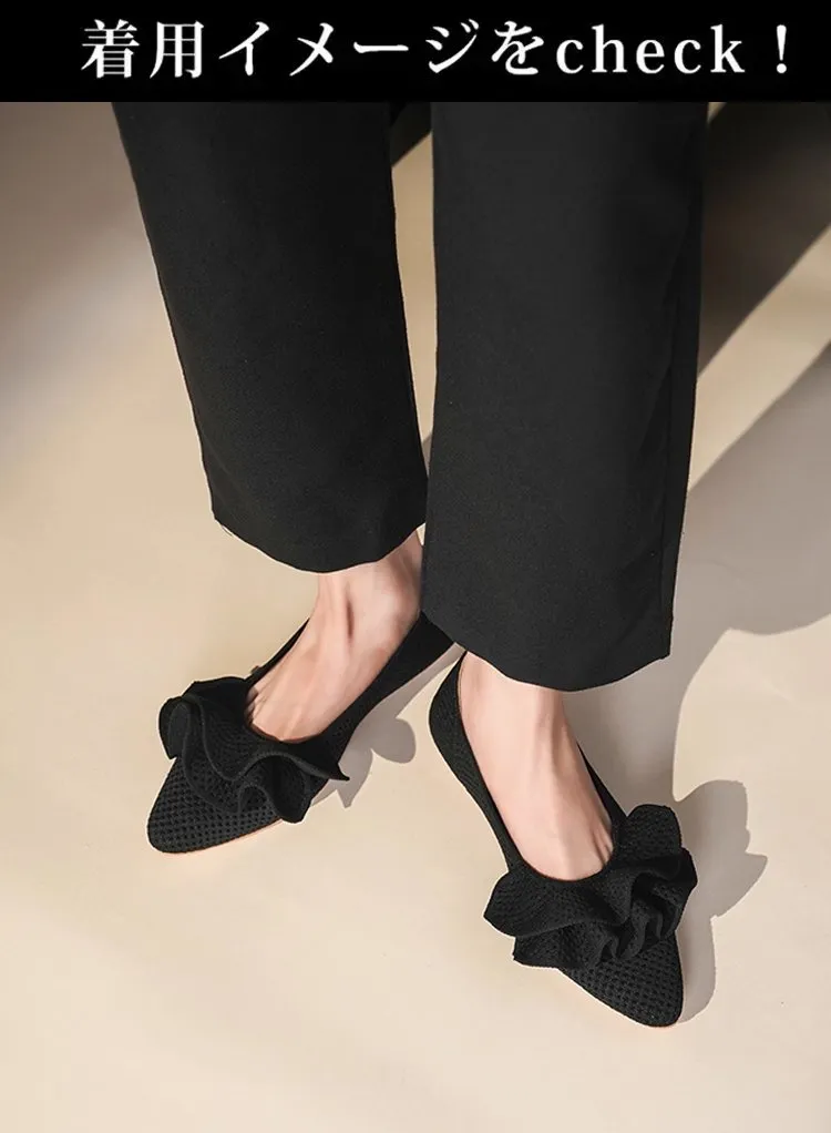 【洗濯機OK・大人可愛いフリル】KENPOGEN ニットパンプス ぺたんこ靴 スクエアトゥ 柔らかい 伸縮性 走れる 全十色展開 通勤 お出かけ