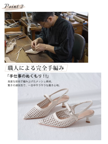 【通気性抜群】KENPOGEN スリングバックサンダル 編み込みデザイン ポインテッドトゥ 4.5cmヒール 歩きやすい オフィスカジュアル 春夏